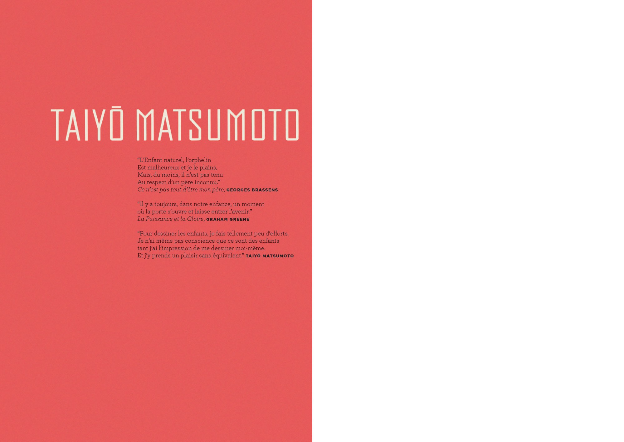 Depuis ses débuts en 1987, Taiyō Matsumoto s'est affirmé comme un auteur majeur du manga, conjuguant une recherche permanente dans son dessin avec une constance des sujets qui lui sont chers et qui prennent racine dans sa propre enfance. Elaboré en étroite collaboration avec l'auteur, explorant les dimensions thématiques et stylistiques de son œuvre et célébrant plus de trente ans d'une carrière résolument singulière, cet ouvrage vise à proposer une rétrospective à la hauteur de son talent.